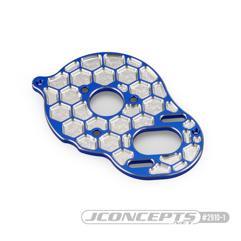 Looking at the typical construction of the second operation processes on standard motor plates, it easy to see why bending is sometimes an issue. The design team at JConcepts has incorporated a honeycomb milling affect with placement more suited to surrounding geometry making the plate lightweight and very rigid in multiple directions. The honeycomb features add a 3D look featuring the natural aluminum while the rest is available blue or black anodized colors. The motor plate is compatible with the Team Associated DR10 and SR10 while remaining lightweight. Slight chamfering on the 3mm thickness material allows the rather beefy plate to look quite slim and trim.