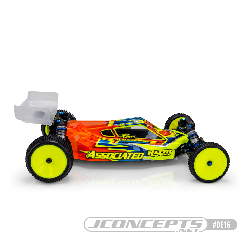 The championship winning item includes two of the 6.5” Carpet | Turf | Dirt wing which is now a standard racing item around the world. The body includes all trim and window lines scribed on the body and masks to quickly cover the inside of the windows for user generated painting technique. The P2 photo car is just an example of what is possible when it comes to custom painting and art performed (not included) around the world. The vivid orange and yellow stunner are painted by Kustom RC Graphics for JConcepts and is a replica of a race scheme developed by Evan Vail.